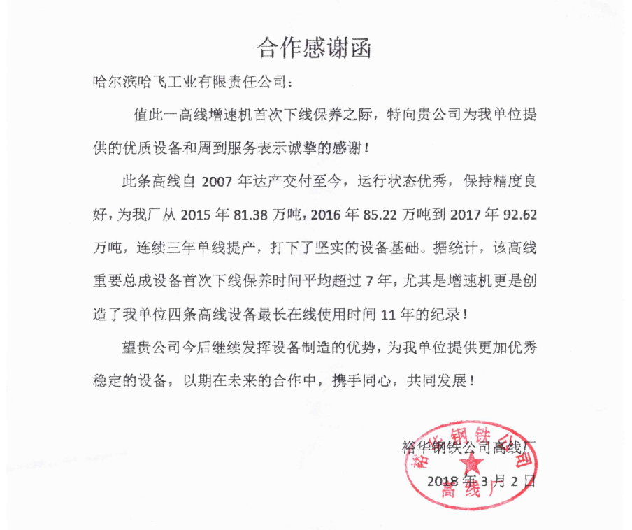 哈爾濱哈飛工業(yè)有限責(zé)任公司旗下的機(jī)電設(shè)備制造產(chǎn)業(yè)是目前國(guó)內(nèi)規(guī)模大、專業(yè)的高速線材軋機(jī)和棒材軋機(jī)整機(jī)及備件的生產(chǎn)制造企業(yè)。公司現(xiàn)坐落于哈爾濱市平房區(qū)汽車零部件工業(yè)園B區(qū),占地面積30000多平方米?,F(xiàn)有員工近550人,其中具有中高級(jí)職稱的研發(fā)及工程技術(shù)人員100余人。   公司曾獲得冶金部授予的“高線軋機(jī)設(shè)備優(yōu)單位”稱號(hào)、國(guó)家技術(shù)進(jìn)步二等獎(jiǎng)等獎(jiǎng)項(xiàng),公司生產(chǎn)的十八項(xiàng)高線軋機(jī)重要部件通過(guò)了技術(shù)鑒定... +MORE